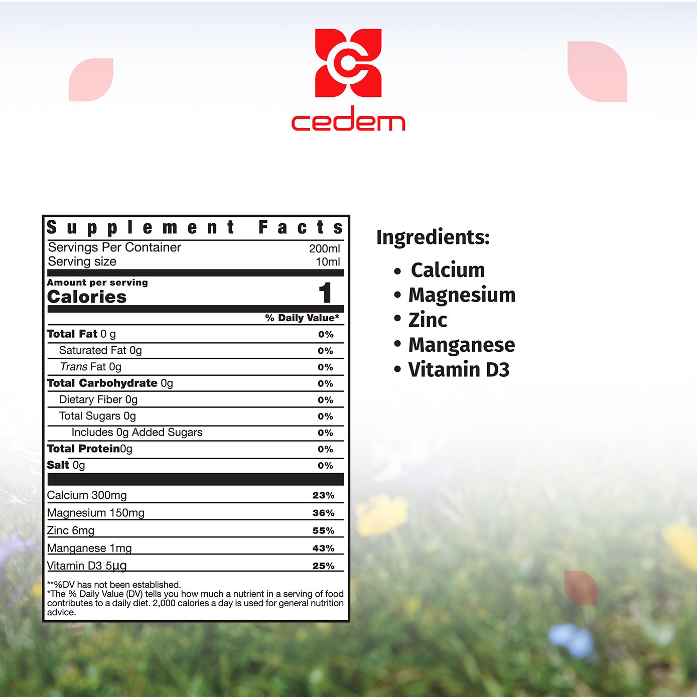 CeBone is a liquid bone growth supplement for kids that combines essential vitamins and minerals for bone and teeth health. Calcium and Vitamin D3 support bone density and growth, while Magnesium, Zinc, and Manganese contribute to a strong bone structure and metabolic health. CeBone’s powerful blend keeps kids’ bones and teeth strong, supports their development, and prevents common nutrient deficiencies.
