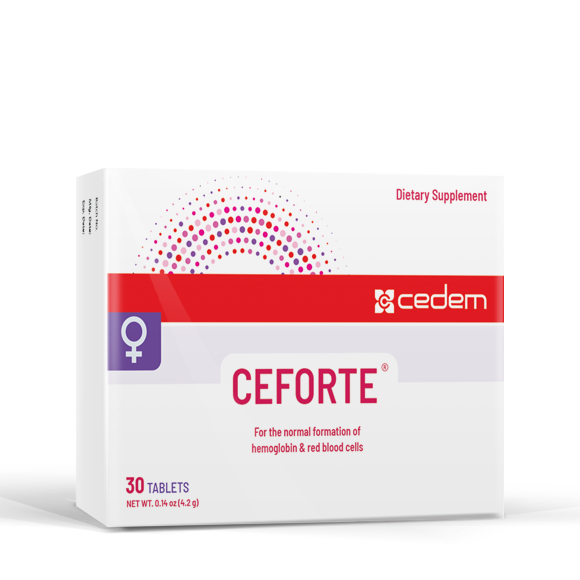 CEFORTE is a specialized food supplement formulated to support red blood cell formation and maintain healthy hemoglobin levels. Essential for pregnant women, it helps meet their increased iron needs, prevents anemia, and normalizes homocysteine levels to support a healthy pregnancy. CEFORTE ensures oxygenation and overall energy metabolism for women.