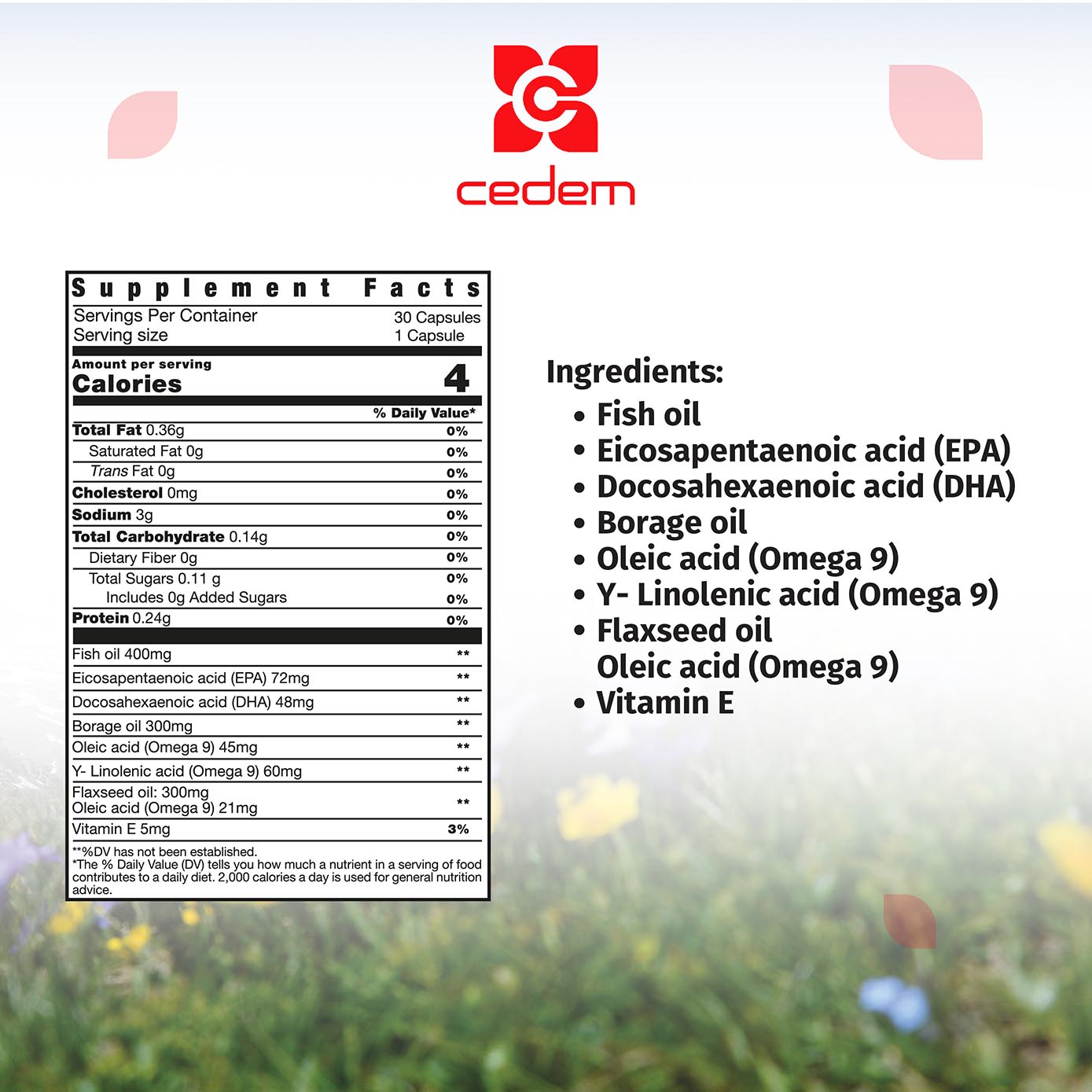 Maintaining heart, brain, and eye health is essential for overall wellness. CEMEGA 3-6-9 + VITAMIN E offers comprehensive support with its unique combination of essential fatty acids—Omega-3, Omega-6, and Omega-9—sourced from Fish Oil, Borage Oil, and Flaxseed Oil. Enhanced with Vitamin E for antioxidant protection, this advanced formula promotes cardiovascular health, cognitive function, and vision clarity, making it a cornerstone of daily wellness.