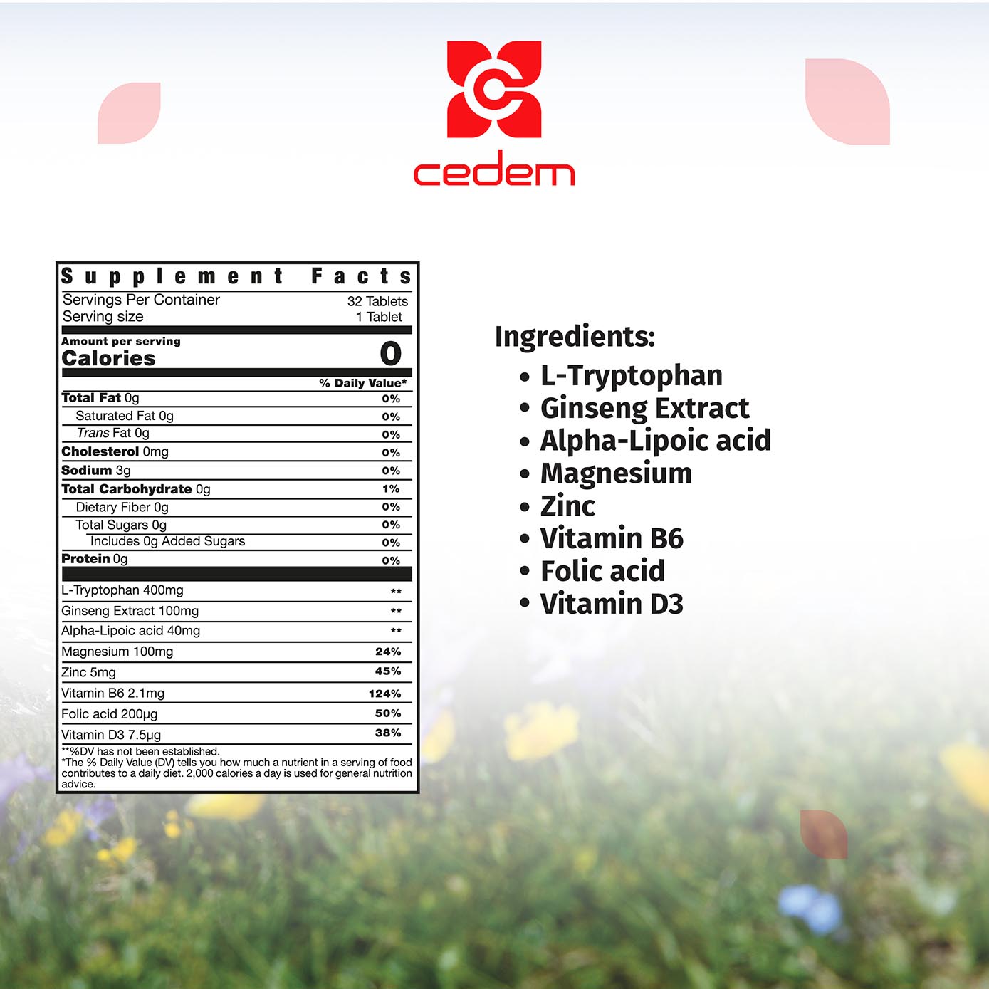 L-Tryptophane (400 mg), Ginseng Extract (100 mg), Magnesium (100 mg), Alpha-Lipoic Acid (40 mg), Zinc (5 mg), Vitamin B6 (2.1 mg), Folic Acid (200 μg), Vitamin D3 (7.5 μg).
