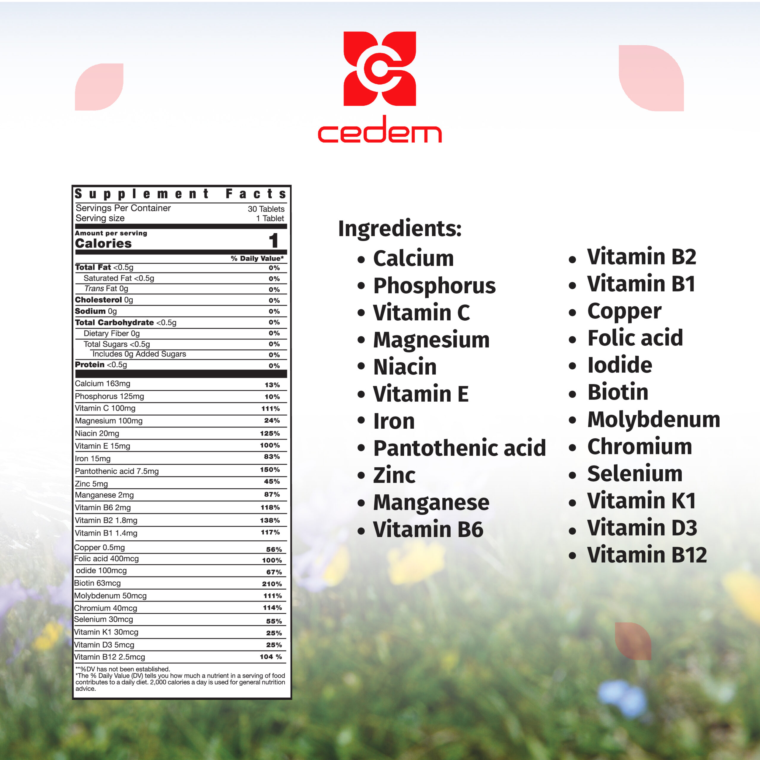 Calcium (163 mg), Vitamin C (100 mg), Magnesium (100 mg), Niacin (20 mg), Vitamin E (15 mg), Iron (15 mg), Pantothenic Acid (7.5 mg), Zinc (5 mg), Manganese (2 mg), Vitamin B6 (2 mg), Vitamin B2 (1.8 mg), Vitamin B1 (1.40 mg), Iodide (0.1 mg), Copper (500 μg), Folic Acid (400 μg), Biotin (63 μg), Molybdenum (50 μg), Chromium (40 μg), Selenium (30 μg), Vitamin K1 (30 μg), Vitamin B12 (2.5 μg), Vitamin D3 (5 μg).