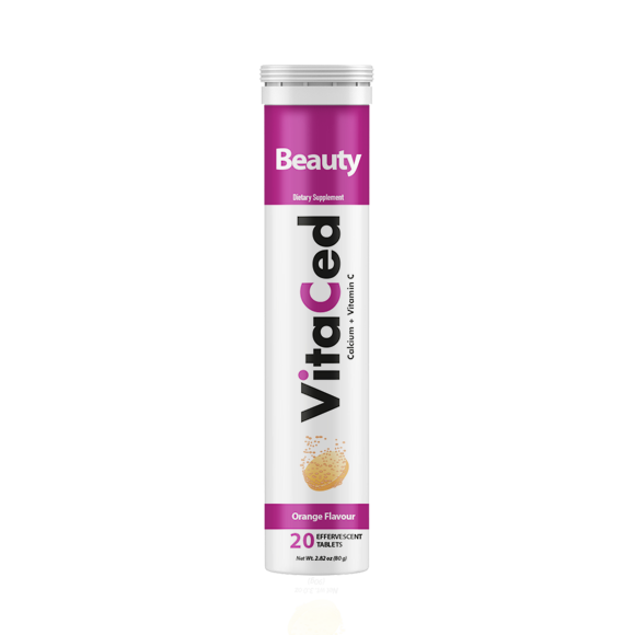 VITACED Beauty combines Calcium and Vitamin C to support healthy bones and radiant skin. This supplement helps with calcium absorption for bone integrity and reduces deficiencies in Calcium and Vitamin C, essential for skin health and vitality.