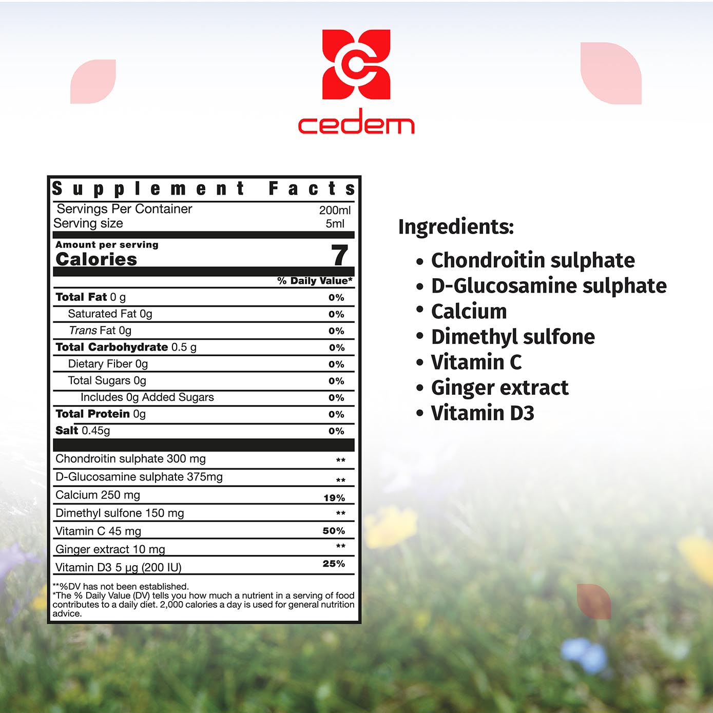 D-Glucosamine Sulphate (375 mg), Chondroitin Sulphate (300 mg), Calcium (250 mg), Dimethyl Sulfone (150 mg), Vitamin C (45 mg), Ginger Extract (10 mg), Vitamin D3 (5 μg).