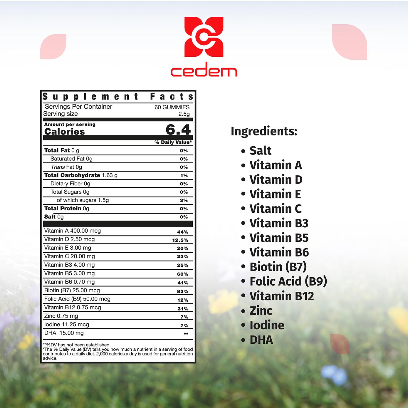 Vitamin C (20 mg), DHA (15 mg), Vitamin B3 (4 mg), Vitamin E (3 mg), Vitamin B5 (3 mg), Zinc (0.75 mg), Vitamin B6 (0.7 mg), Vitamin A (400 μg), Folic Acid (50 μg), Biotin (25 μg), Iodine (11.25 μg), Vitamin D (2.5 μg), Vitamin B12 (0.75 μg).