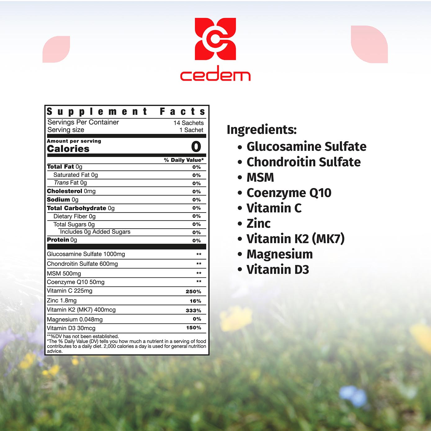 Glucosamine Sulfate (1000 mg), Chondroitin Sulfate (600 mg), Methylsulfonylmethane (500 mg), Vitamin C (225 mg), Coenzyme Q10 (50 mg), Zinc (1.8 mg) (from Zn sulfate 5.00 mg), Magnesium (0.048 mg) (from Mg Citrate 0.30 mg), Vitamin K2 (400 μg), Vitamin D3 (30 μg).